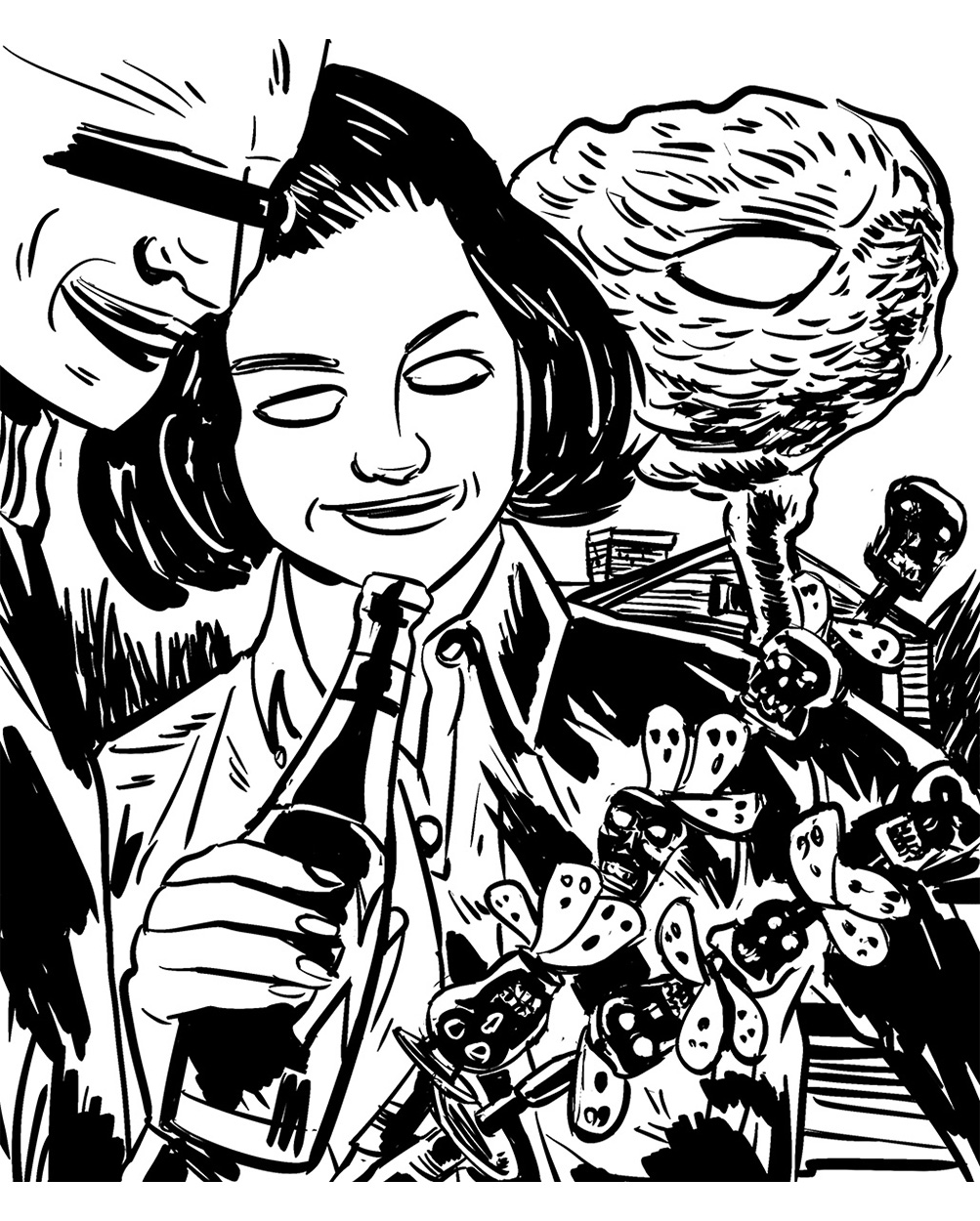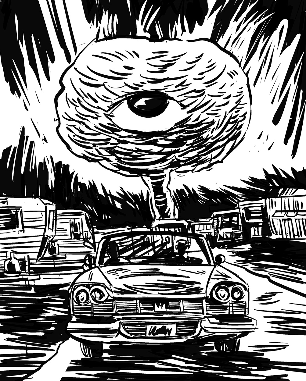 A towering shadow, both menacing and terrible, hangs like a dream smeared shroud. It drifts hazily, floating over a reassuring aroma of fresh-mown lawns and household cleaning products. Families of neck-tied men, cotton dress women and bright, curious children populate suburban scenes. Here we see figures and signs, actions and reactions; the ancient drama of human society, striving for a perfect world, while intrinsically engulfed in the inky ring of an apocalyptic death-cult.