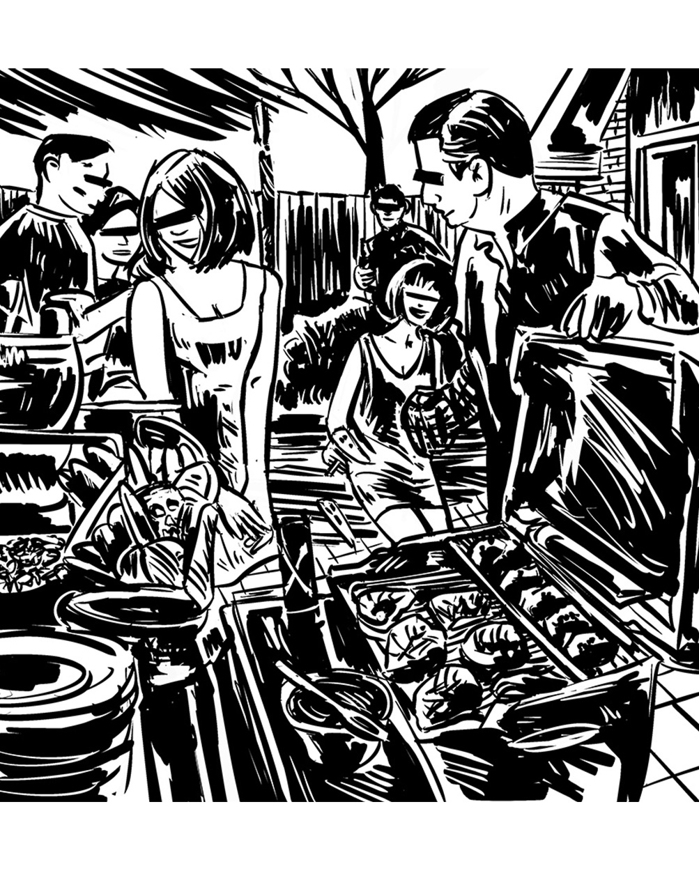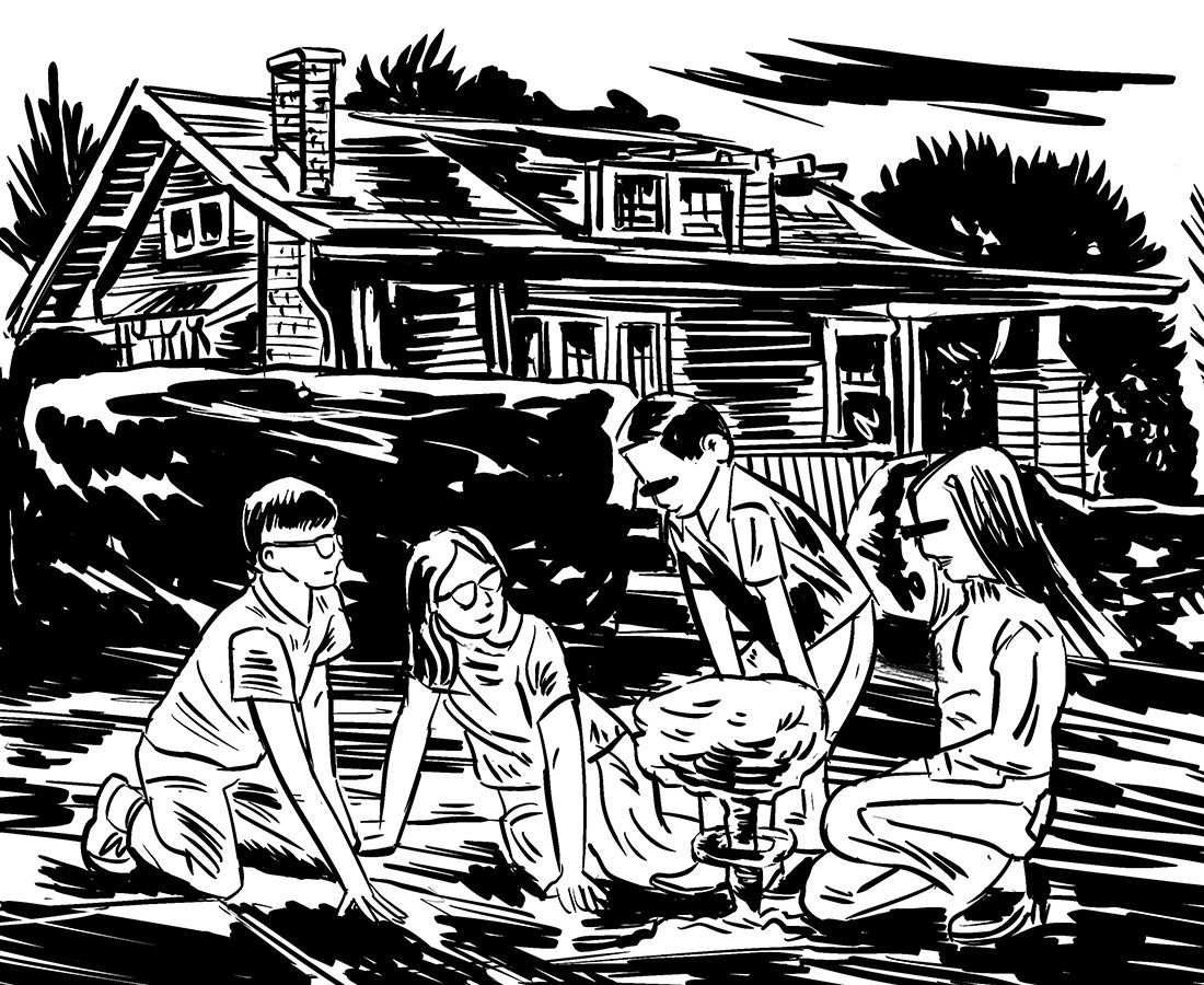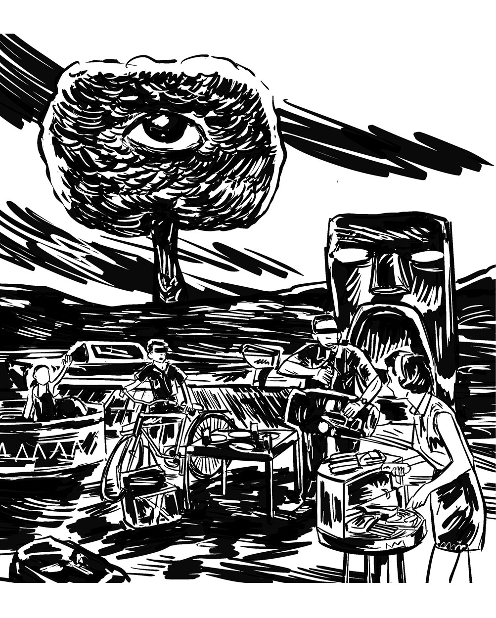 A towering shadow, both menacing and terrible, hangs like a dream smeared shroud. It drifts hazily, floating over a reassuring aroma of fresh-mown lawns and household cleaning products. Families of neck-tied men, cotton dress women and bright, curious children populate suburban scenes. Here we see figures and signs, actions and reactions; the ancient drama of human society, striving for a perfect world, while intrinsically engulfed in the inky ring of an apocalyptic death-cult.