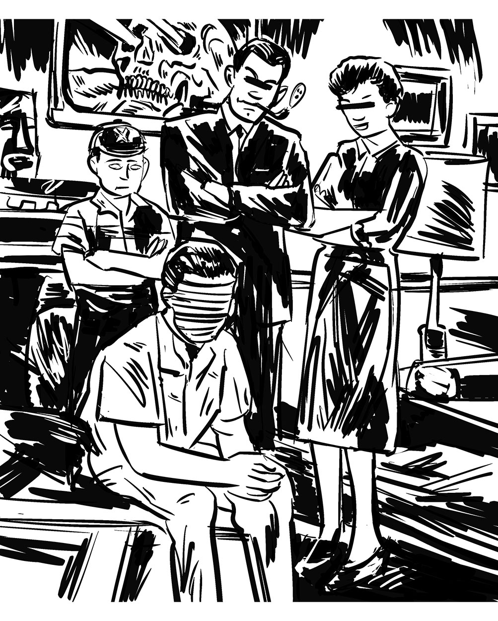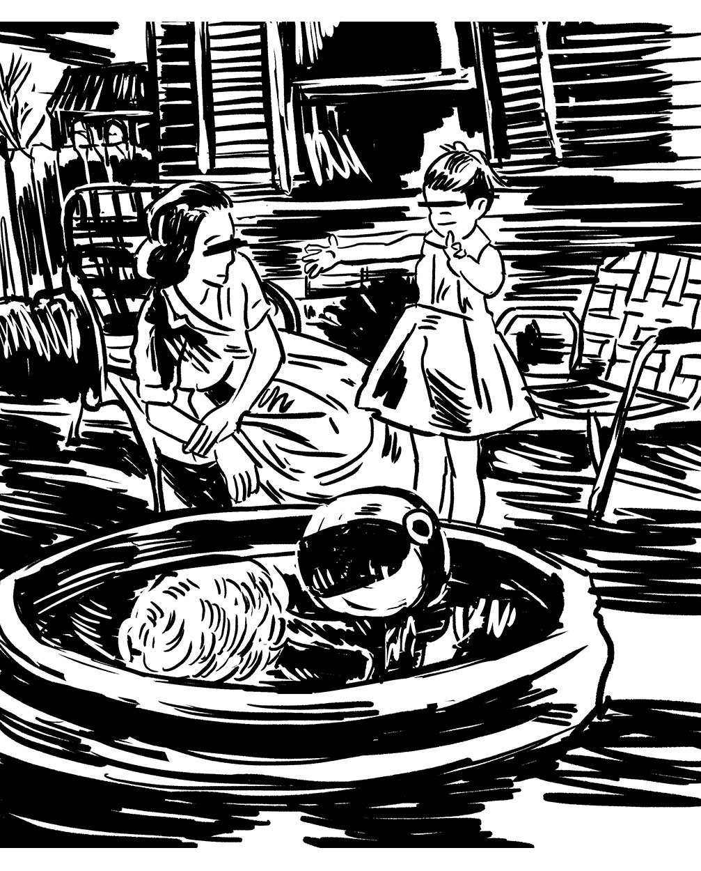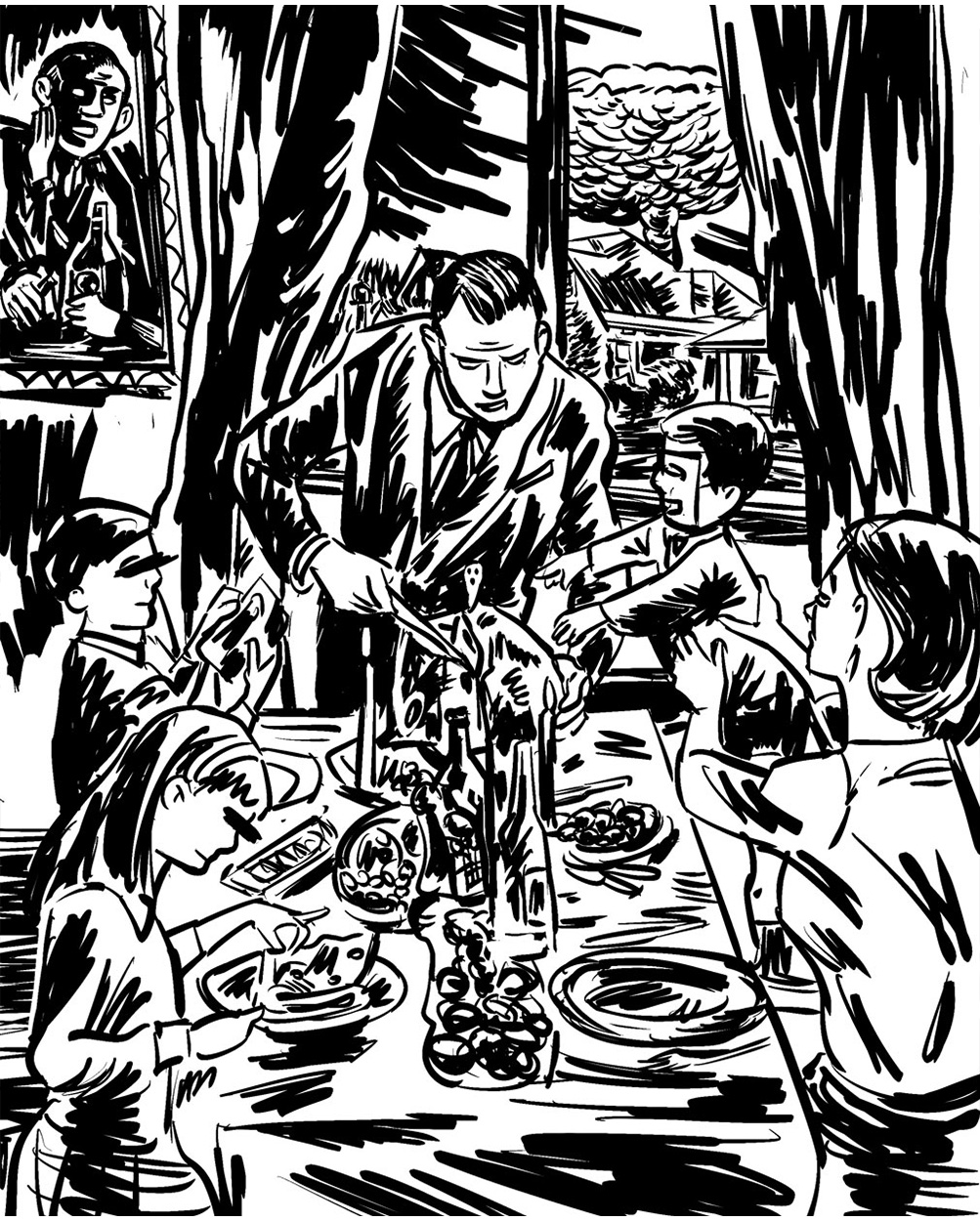 A towering shadow, both menacing and terrible, hangs like a dream smeared shroud. It drifts hazily, floating over a reassuring aroma of fresh-mown lawns and household cleaning products. Families of neck-tied men, cotton dress women and bright, curious children populate suburban scenes. Here we see figures and signs, actions and reactions; the ancient drama of human society, striving for a perfect world, while intrinsically engulfed in the inky ring of an apocalyptic death-cult.