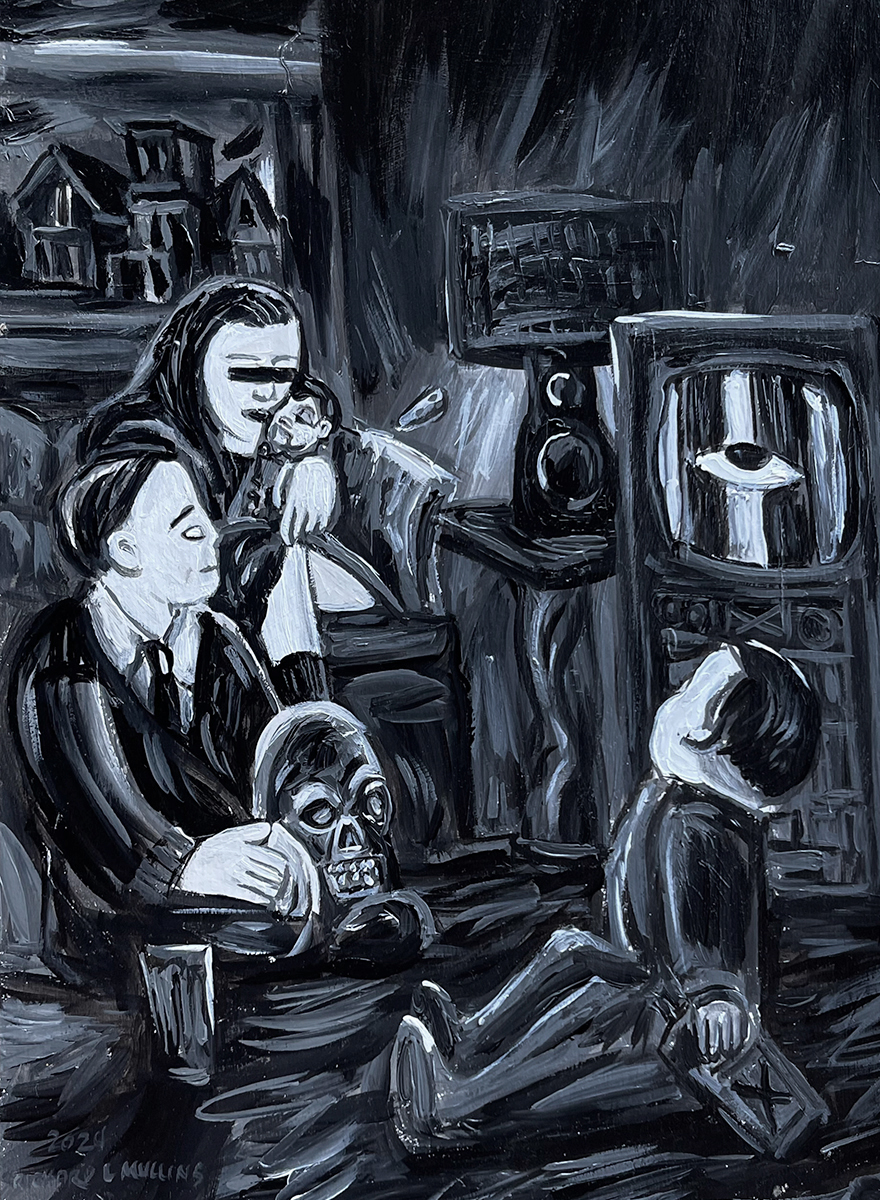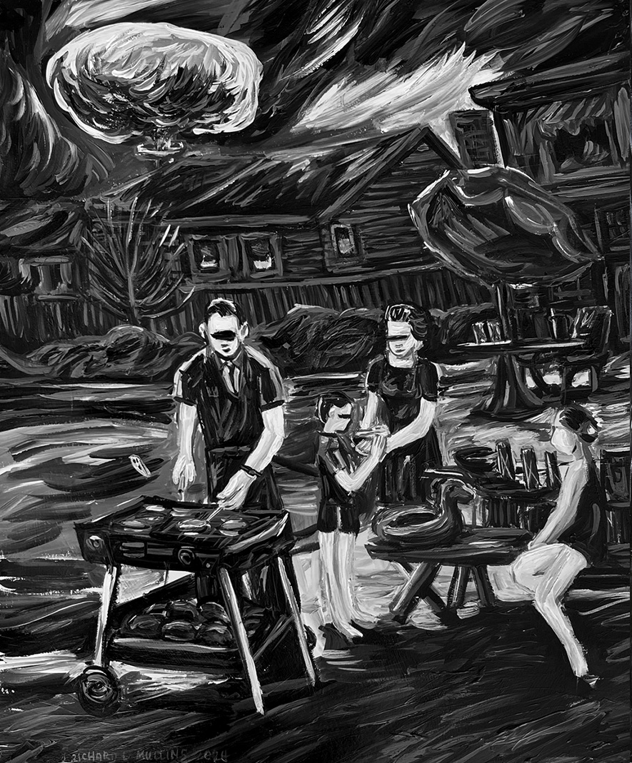 A towering shadow, both menacing and terrible, hangs like a dream smeared shroud. It drifts hazily, floating over a reassuring aroma of fresh-mown lawns and household cleaning products. Families of neck-tied men, cotton dress women and bright, curious children populate suburban scenes. Here we see figures and signs, actions and reactions; the ancient drama of human society, striving for a perfect world, while intrinsically engulfed in the inky ring of an apocalyptic death-cult.